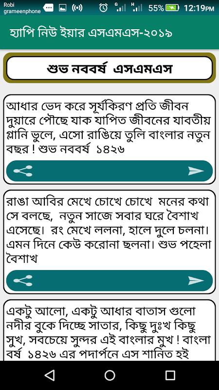 আমি হ্যাপি নিউ ইয়ার ২০১৯এসএমএস (Happy New Year 2019 sms) /শুভ নববর্ষ এসএমএস এবং বাংলা ও ইংরেজি হ্যাপি নিউ ইয়ার এসএমএস যোগ করেছি ।বাংলা এসএমএস-Bangla SMS অ্যাপটির মাধ্যমে খুব সহজে আত্বীয় স্বজন ও বন্ধু বান্ধবদের কাছে এসএমএস পাঠাতে পারবেন ।