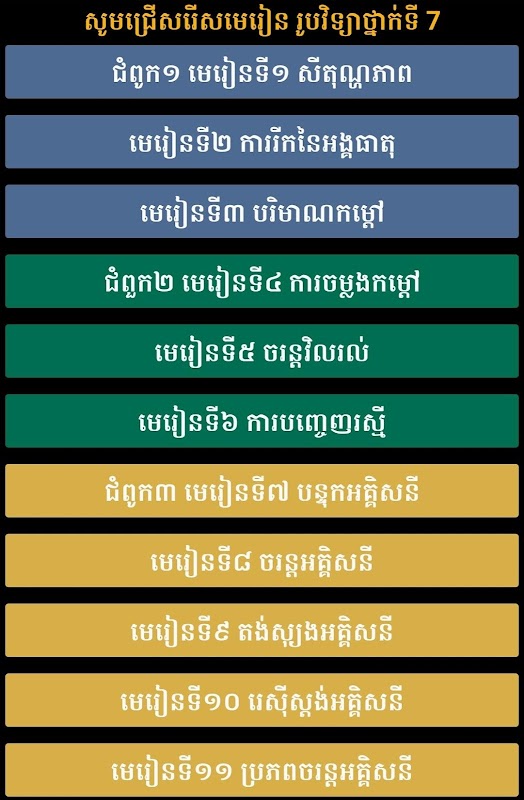 캄보디아의 고등학생과 교사가 주머니에 넣기 위해 매우 중요하고 궁핍한 앱입니다. 교사를 위해 이 앱은 핸드헬드 장치에서 6권의 책에 접근할 수 있는 가장 쉬운 방법을 제공합니다. 학생들의 경우 앱은 참조 책과 공식에 더 빠르게 도달할 수 있습니다.
