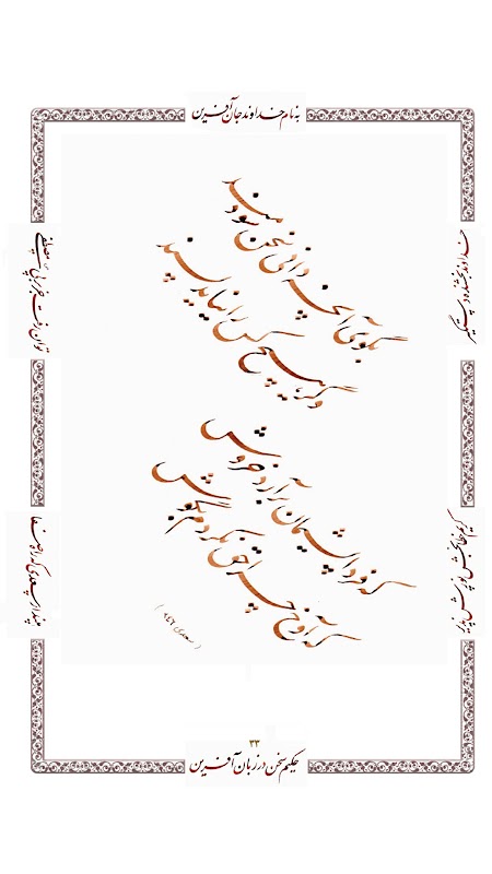 감사하게도 사디의 달콤한 일화를 모아놓은 다음 책은 사디 술탄의 연설의 사상과 언어에서 나오는 도덕적으로 최고 수준의 유익하고 문학적인 내용을 담고 있으며, 알파벳 각 글자에 대한 온갖 연결과 획의 예와 함께 서예 예술로 장식되어 있어 초등학생부터 고급생까지 유용하게 사용할 수 있을 것입니다. 서예 교육은 쓰기와 갈필의 두 부분으로 나뉘지만 교육의 일반적인 규칙은 두 가지 범주로 나누어집니다: 교사의 교육 형식은 좋은 무게와 좋은 형성이며 차이는 없습니다. 단지 1차원 쓰기와 2차원 갈대에서 단어의 강약의 법칙만 연습하고 가르칩니다. 학생의 일상 연습에서 서예는 특별한 정확성이 필요하며 학생의 지속적인 연습은 이론 및 실습의 두 부분으로 이루어지며 주요 예는 학생의 과학적이고 실제적인 기초입니다. 그리고 학생의 재능, 관심, 인내에 따라 각 세션은 더 높은 수준으로 업그레이드될 수 있으며, 학습의 휴식과 교사와의 직접적인 의사소통은 학생의 이론적, 실제적, 도덕적 발전으로 이어지지만 시간과 장소는 학습에 직접적인 영향을 미칠 수 있습니다.