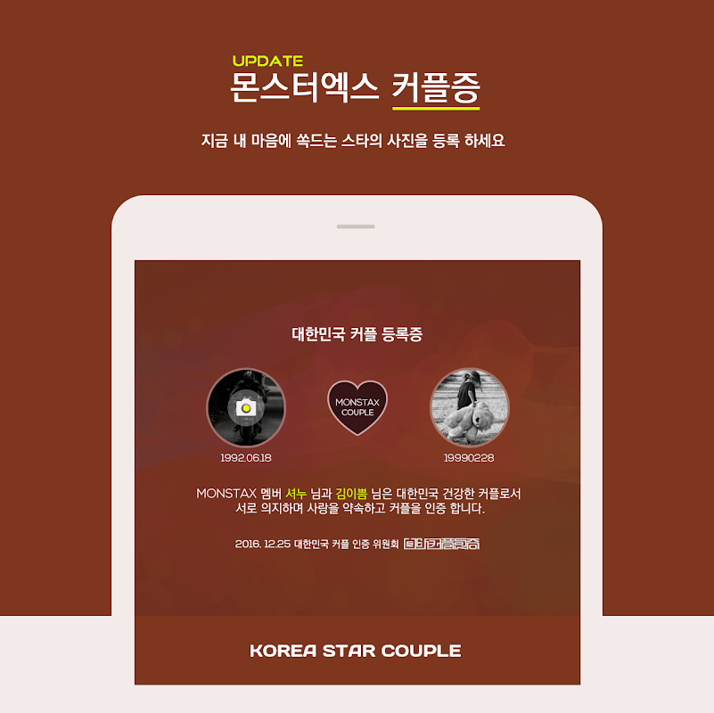 매니아 팬덤 이라면 누구나 꿈꾸는 나만의 스타와 커플증을 만드는 앱으로 좋아하는 몬스타 엑스 멤버를 선택하여 가상의 커플증을 만들어 보세요.