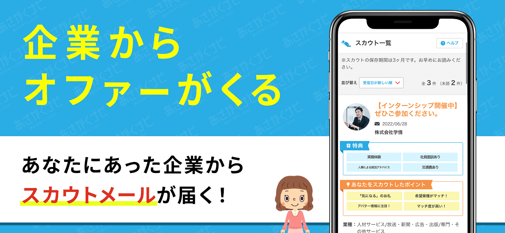 新卒・就活生のためのスカウト型インターン・就活準備サイト『あさがくナビ2024』の公式アプリです。