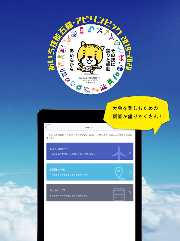 2019 년 아이 치현에서 개최되는 「아이치 기능 올림픽 · 아비린핏쿠 '의 관전 가이드 북 애플리케이션입니다.