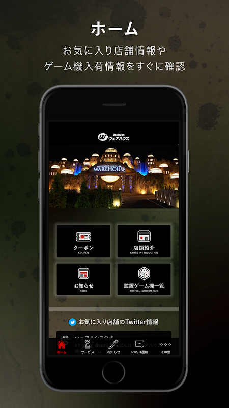 대형 게임 센터 '당신의웨어 하우스'의 공식 앱이 탄생! 엔터프라이즈 입고 정보와 게임 입하 정보는 물론, 푸시 알림 캠페인 정보 나 유익한 정보도 전달!
