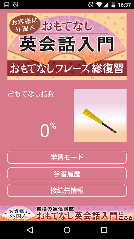 "환대 영어 회화 입문 환대 문구 총 복습 '는 일본 영어 검정 협회의 통신 강좌"고객은 외국인 환대 영어 회화 입문」수강생을 위해이 강좌에 수록된 환대 문구 복습을 목적으로 한 응용 프로그램입니다 .