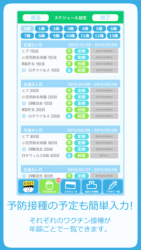 子どもの生年月日を入力することで、0~13歳の予防接種スケジュールを組み立てられます。