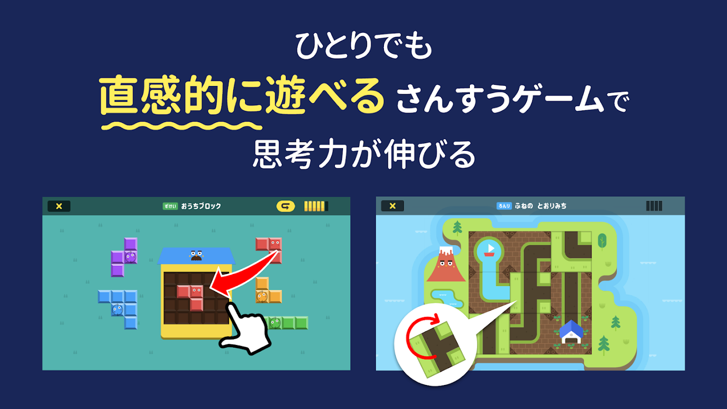 유아의 아이가 혼자라도 직관적으로 놀 수 있는 게임으로 사고력을 기릅니다. 수량이나 도형, 논리 등 초등학교 이후에 필요한 산수의 기초가 익습니다. ※유아 레벨부터 초등학교 2학년 레벨의 내용까지 망라