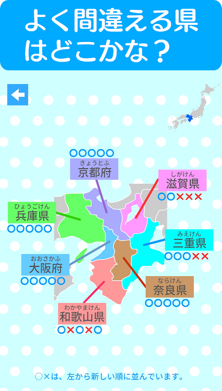 퀴즈에서 틀린 도시는 정답이 빨간색으로 일본지도에 표시되므로 다음 퀴즈 때는 정답하도록 확실하게 기억합시다.