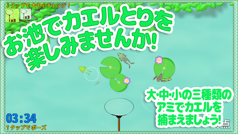 개구리를 잡을 때마다 점수를 획득! 4 분에서 고득점을 목표로합시다!