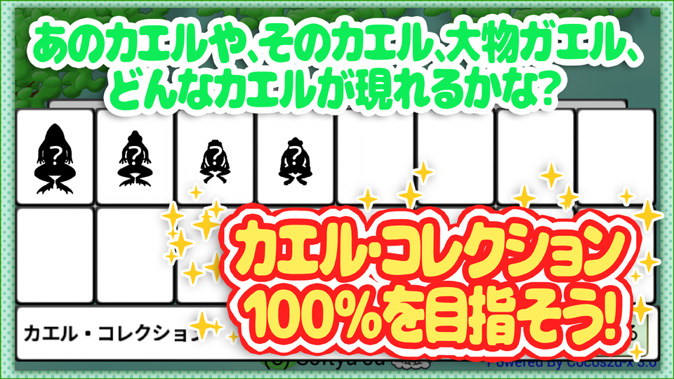 잡는 것이 어려운 레어 개구리도 있습니다! 차분히 노리고 개구리 컬렉션 100 %를 달성시켜보세요!
