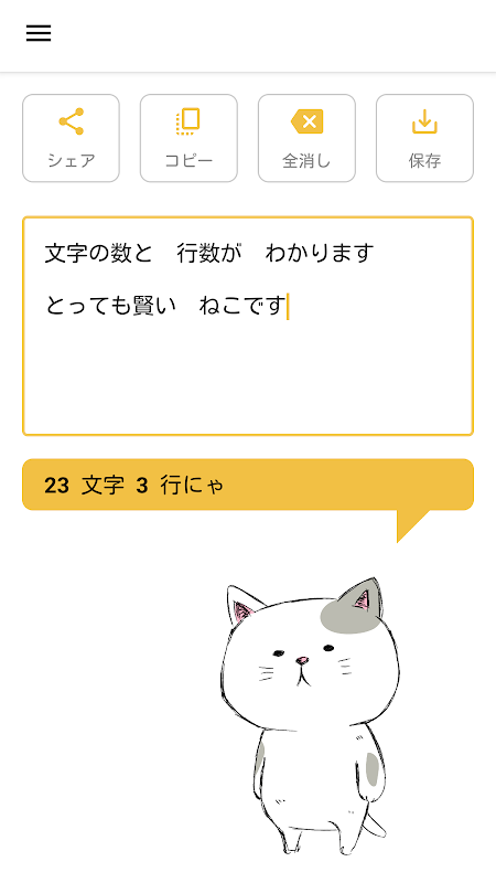 고양이가 문자 수와 줄 수를 알려줍니다.