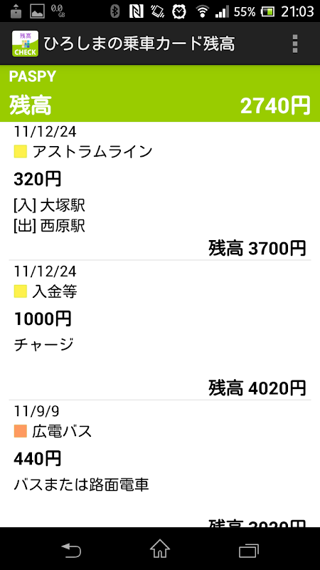 広島圏内の交通系ICカードの使用履歴と残高を表示するシンプルなアプリです。