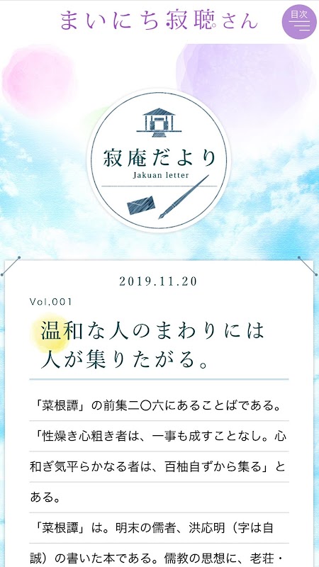 스마트 폰에서 만날 수있는, 읽을 寂聴 씨. 매일 방문하여 건강과 지혜를 받아보세요. 제비, 寂聴 검정 등 불교의 가르침에 동행하면서 얽매이지 않는 즐거운 신감각 응용 프로그램입니다