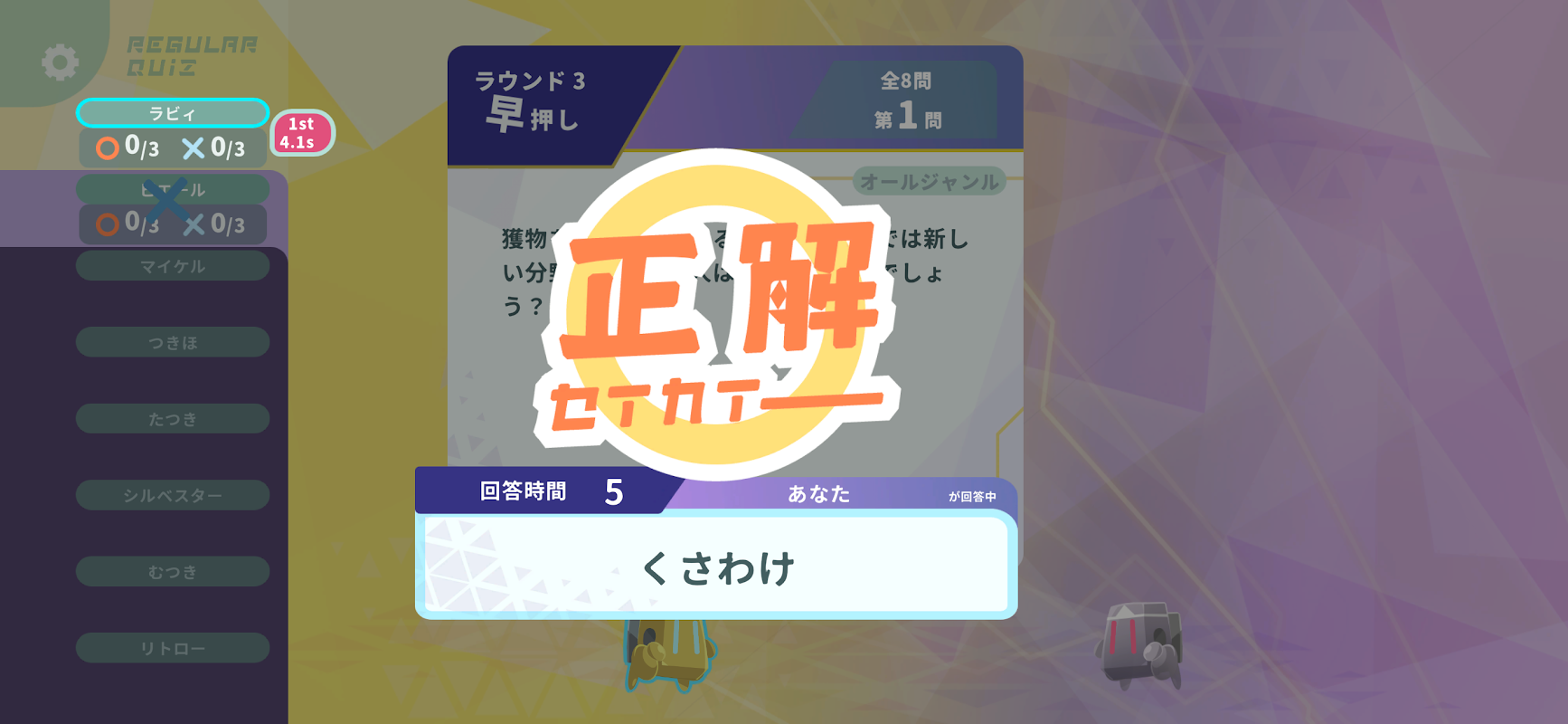 라비호시는 언제든지, 누구와도! 최대 8명이 함께 놀 수 있는 온라인 퀴즈 게임. 「퀴즈의 카케라」가 떠오르는 신비한 행성을 무대로, 퀴즈로 행성의 빛을 되찾자!