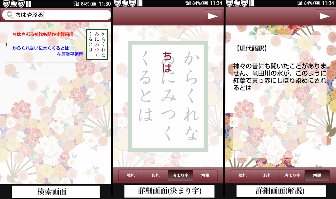 카르타 낭독의 다른 단가의 의미와 결정자를 조사 기능도 있습니다. 경기 카 루타 용으로는 물론 초보자, 백인 일수 대해 공부하고 싶은 분에게 추천합니다.