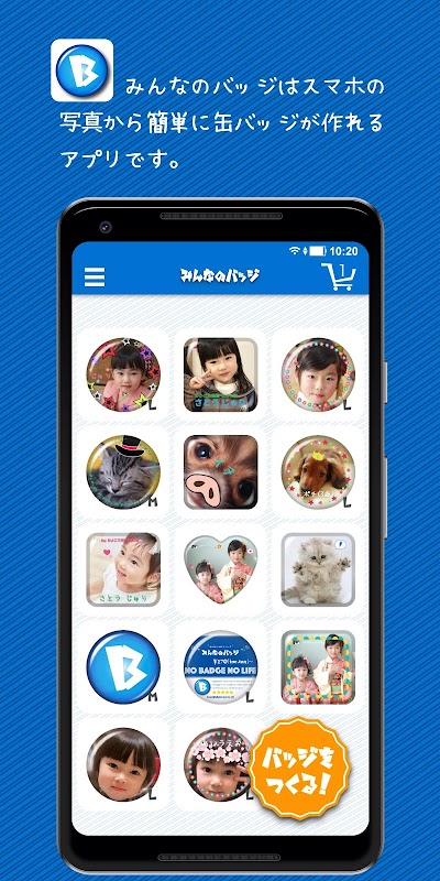 모두의 배지는 스마트 폰으로 찍은 좋아하는 사진과 이미지를 사용하여 캔 배지를 만들고 주문할 수있는 응용 프로그램입니다.