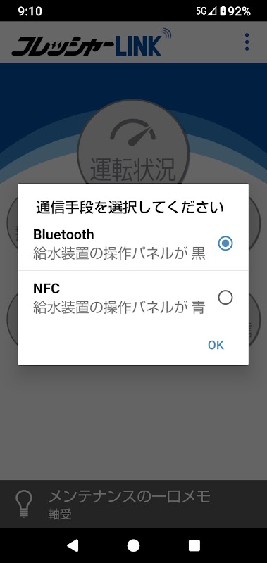 급수 유닛 표시기의 안테나에 스마트폰을 터치하여 NFC 통신에 의해 운전 정보를 읽습니다.
