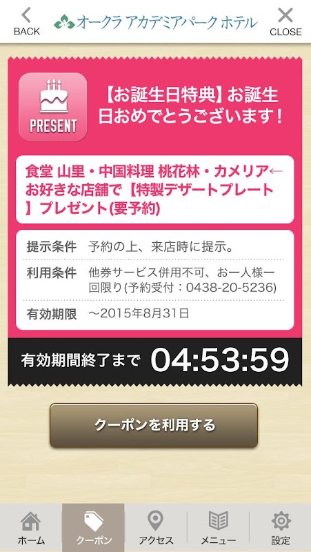호텔의 애플리케이션에는 브라이들 페어와 레스토랑 정보, 각종 이벤트 행사 등 응용 프로그램 회원을 제공하는 제철에서 유익한 정보가 가득합니다. 또한 비 정기적으로 배달되는 '응용 회원님 한정 레스토랑 쿠폰 "은 가족이나 친구와의 식사도 부담없이 이용할 수있는 것은 물론, 기업 · 단체의 간사님께도 강한 편입니다. 각종 연회 총무를 부탁하는 경우가 많다 고객은 유익한 쿠폰을 놓치지 마세요! !