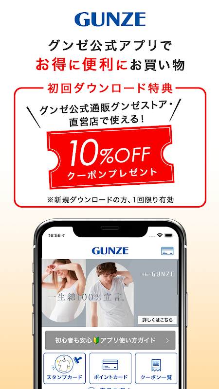 이너 · 속옷 · 속옷 GUNZE (군제)의 공식 앱. 군제 공식 우편 주문과 점포 모두에서 사용할 수 있는 포인트, 유익한 쿠폰을 획득할 수 있는 스탬프 등 특전이 가득.