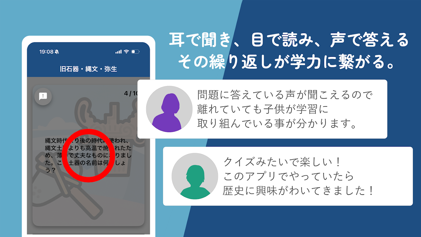코에코타는 「눈으로 보고」 「귀로 듣고」 「목소리로 대답한다」중학 수험 대책의 역사 문제 어플입니다. 아이 자신이 회답을 발생 소리하는 것으로, 역사의 지식의 정착을 촉구합니다.