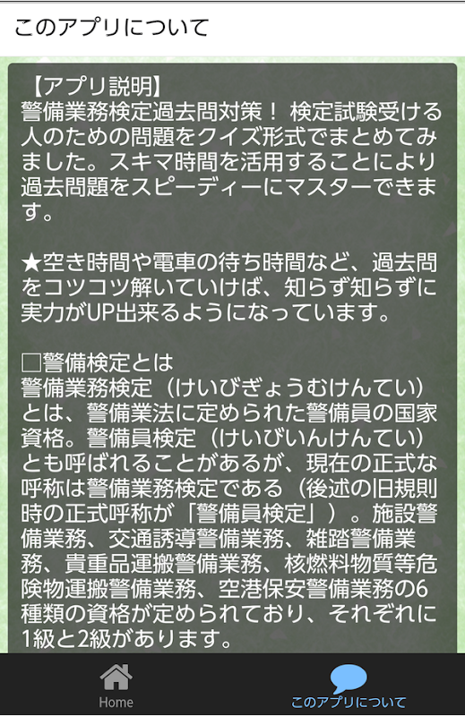 【アプリ説明】警備業務検定過去問対策! 検定試験受ける人のための問題をクイズ形式でまとめてみました。スキマ時間を活用し過去問題をスピーディーにマスターできます