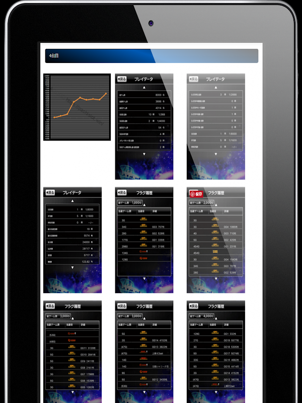 ・各機種ごと、各設定ごとにシミュレートしたスランプグラフや差枚数のデータを、ウェブサイト経由で見ることが出来ます。