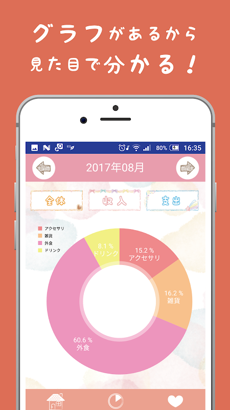 매월의 「수입」 「지출」별로 그래프로 확인할 수 있습니다.