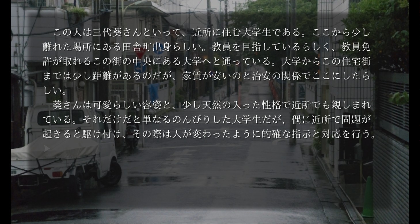 「EightStories」で再構築されたプログラムを更に改修し、画面演出を強化。キャラクター画像などはありませんが、より「読み物」としてのデジタルノベルの楽しさを目指しました。
