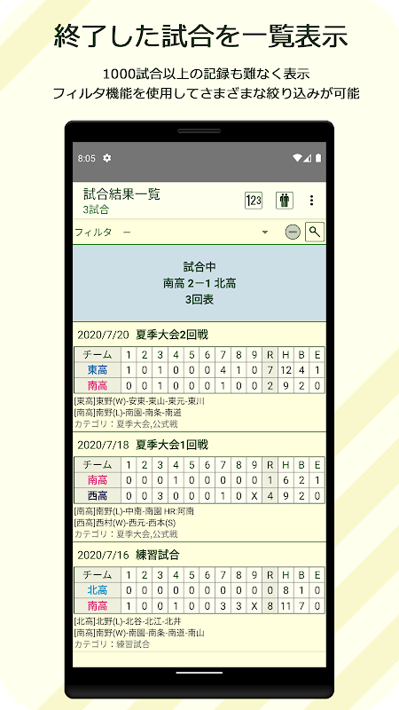 경기 결과를 목록으로 표시하거나 개인 성적 및 팀 성적 목록을 볼 수 있습니다. '경기 카테고리'를 사용하여 '특정 상대 팀', '여름 대회', '연습 경기' 등 다양한 조건으로 목록을 볼 수 있습니다.