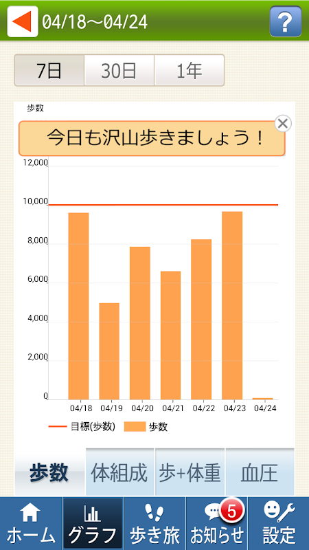 ●日々の振り返りを直感的に!日々の歩数や、記録した体重/血圧を見やすいグラフで確認できます。