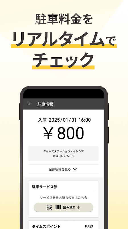 \스마트폰으로 바삭바삭 주차장 정산/대상의 타임즈 주차라면 「스마트폰 정산」&「포인트 쌓인」! 주차장 검색도 가능하며 주차 중 요금 확인도 가능합니다.