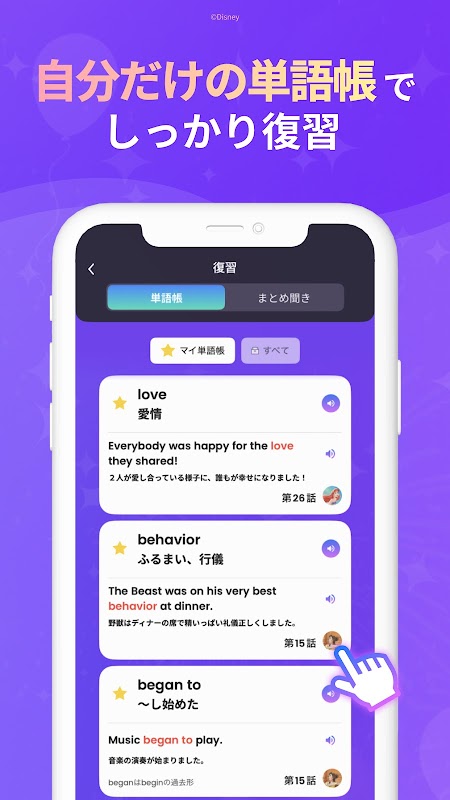 작품의 학습 진도에 따라 컨텐츠가 해방되어 가는 「정리 듣기 기능」은, 바쁜 어른에게 기쁜 「면서 학습」에도 최적.자신의 스케줄에 있었을 때와 장소에서, 디즈니 작품이나 픽사 작품으로 영어 학습을 즐길 수 있습니다.