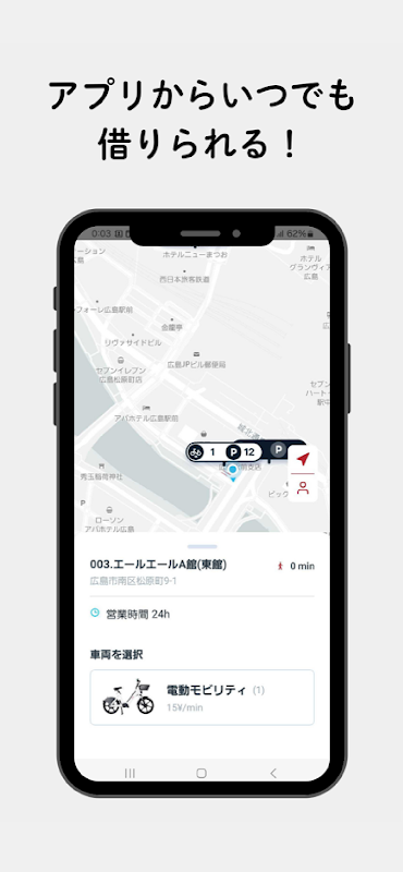 히로시마에서 실증 실험 중! 「전동 모빌리티」쉐어링 서비스의 전용 앱입니다.