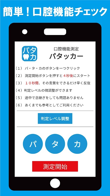 파, 타, 카를 10 초 동안 몇 번 말할 수 있습니까? 스마트 폰으로 간단 자동 측정! "몸의 건강은 입에서"오랄 디어 코키네시스 앱. 판정 레벨 조정 기능 있음.