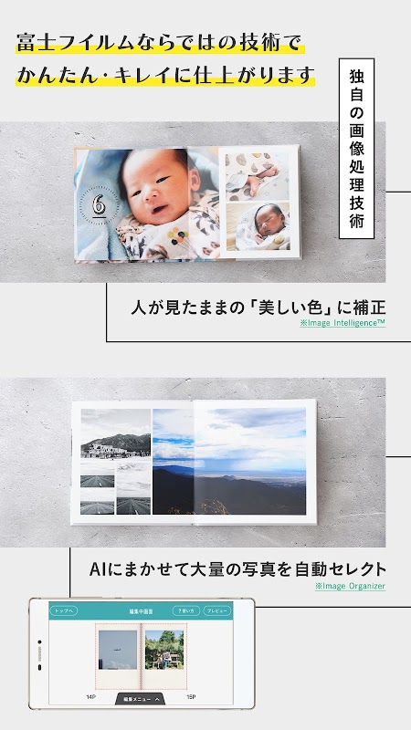 후지 필름 독자적인 화상 판별 기술 「이미지 오가나이자」에 의해, 포토 북에 사용하는 사진을 모두 해석해, 종횡 화상이나 씬에 맞춘 최적인 레이아웃을 실현.