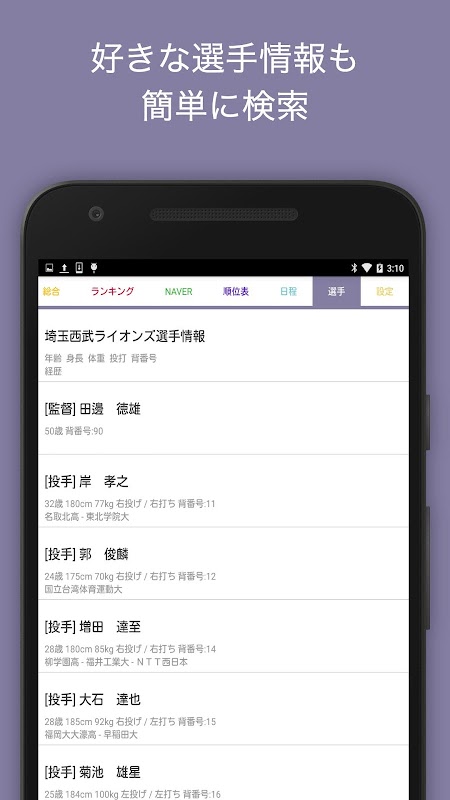 세이부 구단 단체의 정보를 상세히 알 수 있으며, 전 구단의 종합 정보도 얻을 수 있습니다.