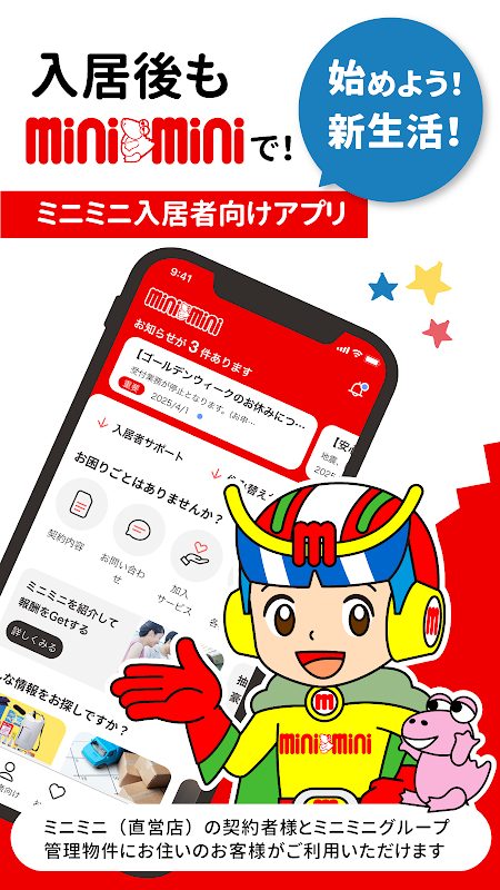 미니 미니 입주자 앱은 문의, 현황 사진 기록, 계약 확인, 절차, 주거 상담 등 임대 생활을 지원하는 편리한 기능을 제공하고 있습니다.