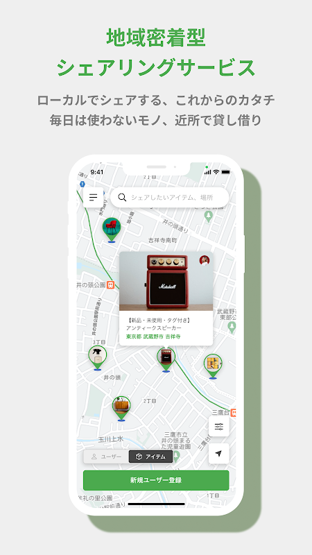 아이템의 대출은, 「1일」단위에서도 「1회」단위에서도 설정할 수 있어, 요금은 0엔에서도 유료라도 임의의 금액을 설정할 수 있습니다.자신이 사용해 봐 편리했던 것, 지금은 사용하고 있지 않다 하지만 버리려면 아쉬운 것을 점점 이웃에게 공개해 주세요!물론, 등록은 무료로, 빌리고 싶은 사람으로부터의 리퀘스트를 유료로 받았을 때만, 플랫폼 이용료가 걸릴 뿐.수령 장소는, 요청을 받기 전에 눈에 띄는 공용 공간을 지정할 수 있으므로 안심입니다.