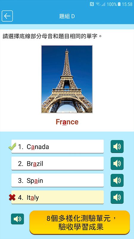 팔 개 훈련 단위의 총, 자체 테스트 기능들을 구별하고 읽을 수있는 능력을 향상, 그래서 당신은 청문회 귀, 영어 포트를 생성하는 동시에, 발음을 배울 수 있습니다.