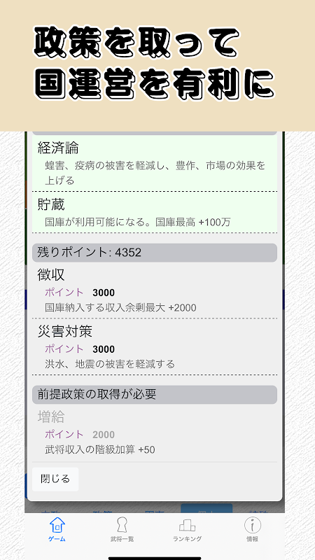 毎日コマンドを入力して、内政や戦争をして統一を目指そう!