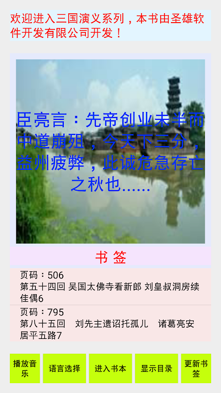 이 응용 프로그램은 쇼 "삼국지"책 전체 응용 프로그램입니다. 1126 페이지 책의 총, "삼국지"멋진 전체 120 장이 응용 프로그램에서 발표했다. 이 책은 사진 관련 "삼국지"의 큰 숫자를 삽입, 그림의 형태로 내용의 "삼국지"부분은 독자에게 표시합니다. 독자들이이 책을 읽을뿐만 아니라, 예술을 즐길 수 있도록, 아름다운 그림책을 제작.