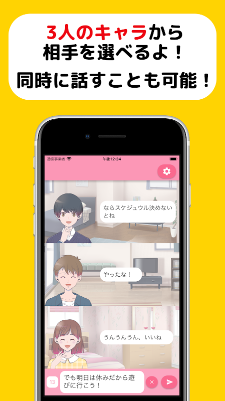 3 명의 캐릭터에서 여러가지 표정과 대화가 돌아 오는거야! 상대를 선택 좋아하는 것,하고 싶은 것을 말하는 수 있습니다. 표정을 보면서 편안하게 대화를 즐겨보세요!