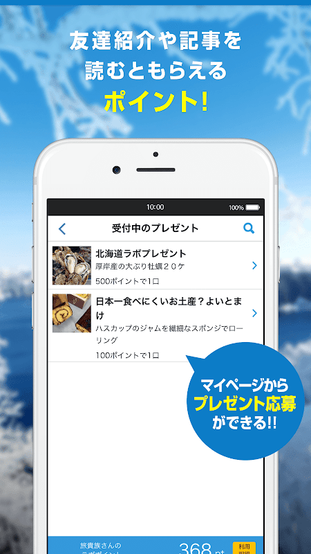 내비게이션 기능에서 가까운 관광 명소와 추천 음식점이 금방 안다! 또한 기사를 읽고 포인트를 모으면, 홋카이도 상품이 맞는 선물에 응모 할 수있다! 사진 투고도 OK!