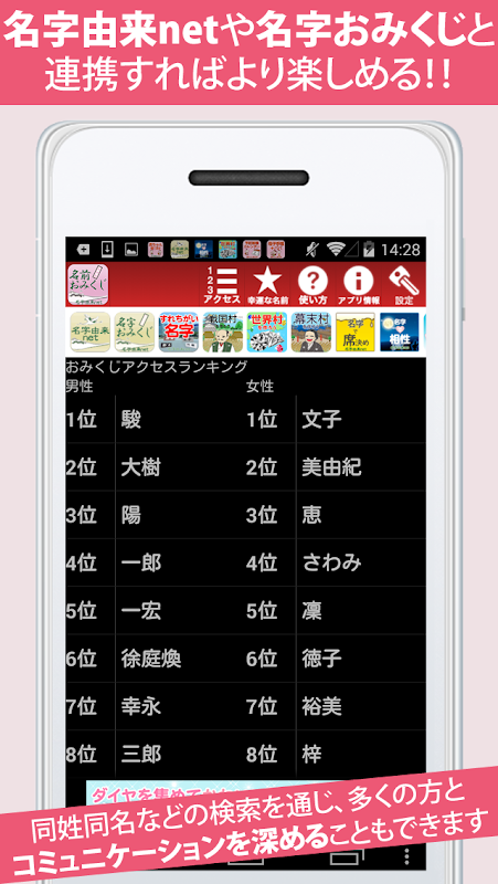 또한, 관련 앱인 「명자 유래 net 어플(무료)」나 「명자 오미쿠지(무료)」와 연계함으로써 ※1,2, 모르는 명자나 드문 이름, 동성 동명 등의 검색을 통해 많은 분 그리고 커뮤니케이션을 깊게 할 수 있습니다.