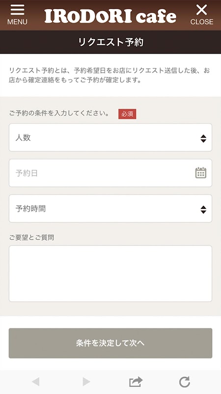 希望の人数・日時を指定して送信するだけで予約を依頼できます。