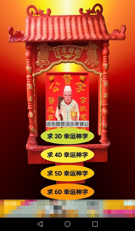这款大马拿督公幸运神字,特别收录了大马槟城乔治市一座拿督公庙里上百年历史的拿督公神像。这款手机应用程式,可以求:千字(3D)、万字(4D)、十万字(5D)和百万字(6D)。