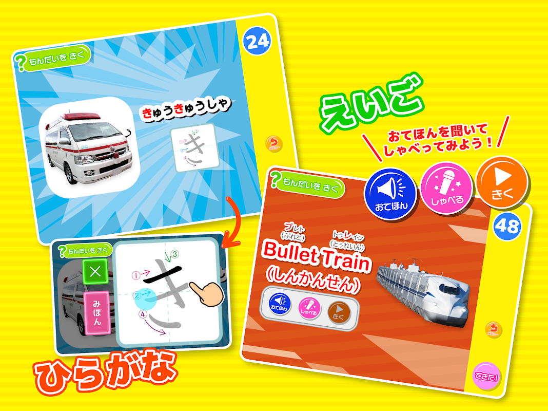 히라가나, 카즈, 에고, 시계를 읽는 방법 등을 다양한 놀이기구의 사진과 함께 즐겁게 배울 수 있습니다.미로나 씰 놀이 등, 놀면서 학습할 수 있는 문제도 가득합니다.