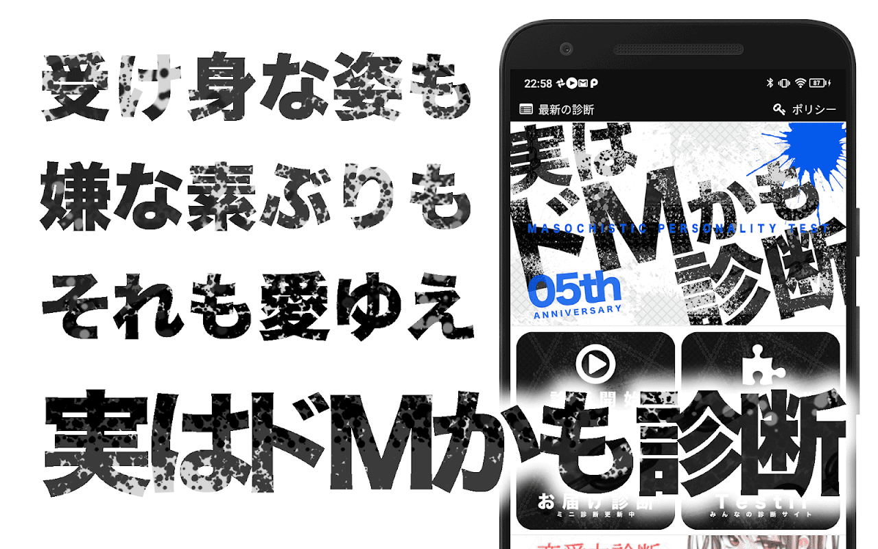 ランダムに出題される15個の心理テストに答えるだけで、アナタのM度が測れちゃう診断ゲームアプリです(^^♪