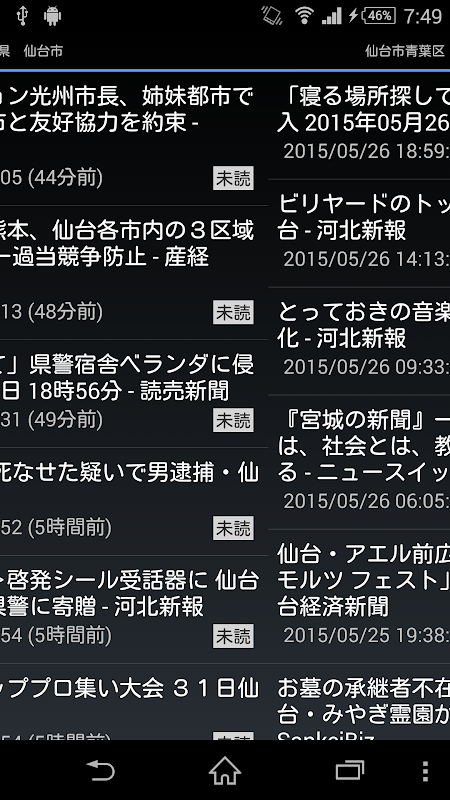 미야기 현의 뉴스를 지역별로 나열하는 응용 프로그램 미야기 현의 지역 뉴스를 표시합니다. 도시별로 표시하고 있습니다.