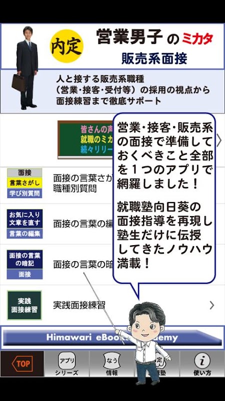 영업 / MR / 판매 / 접객 · 접수 / 운영자 등의 직종 지망 남학생을위한 면접 응용 프로그램. 답변 사례 220 개. 문장 편집 기능. 카메라로 표정을 보면서 면접 연습!