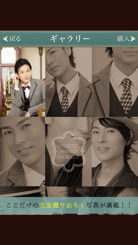 『惠介写真館』はその名の通り、モダンな写真館をコンセプトにした、レトロな趣きを感じる写真集アプリで、『惠ちゃんと温泉旅行編』、『昭和の惠介~タイムスリップ編~』と、2つのギャラリーが置かれ、それぞれ12枚の撮りおろし写真を眺めて楽しむことが出来る。